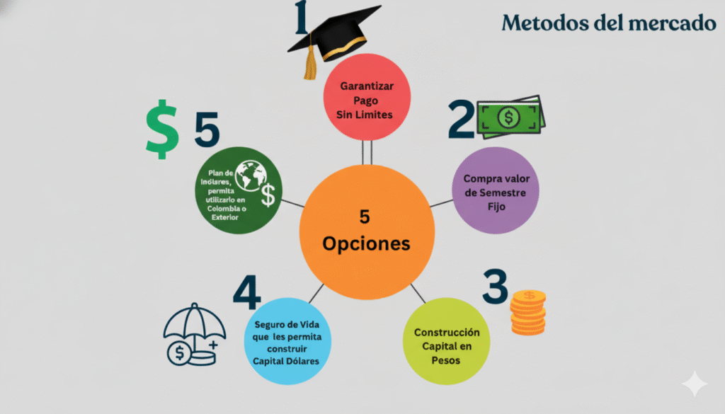 Existen 5 métodos en el mercado: desde planes que garantizan al 100% cualquier universidad, hasta opciones que te permiten fijar el valor del semestre o construir un capital a tu ritmo. Todo se adapta a tus expectativas, capacidad de pago y tiempo de proyección.